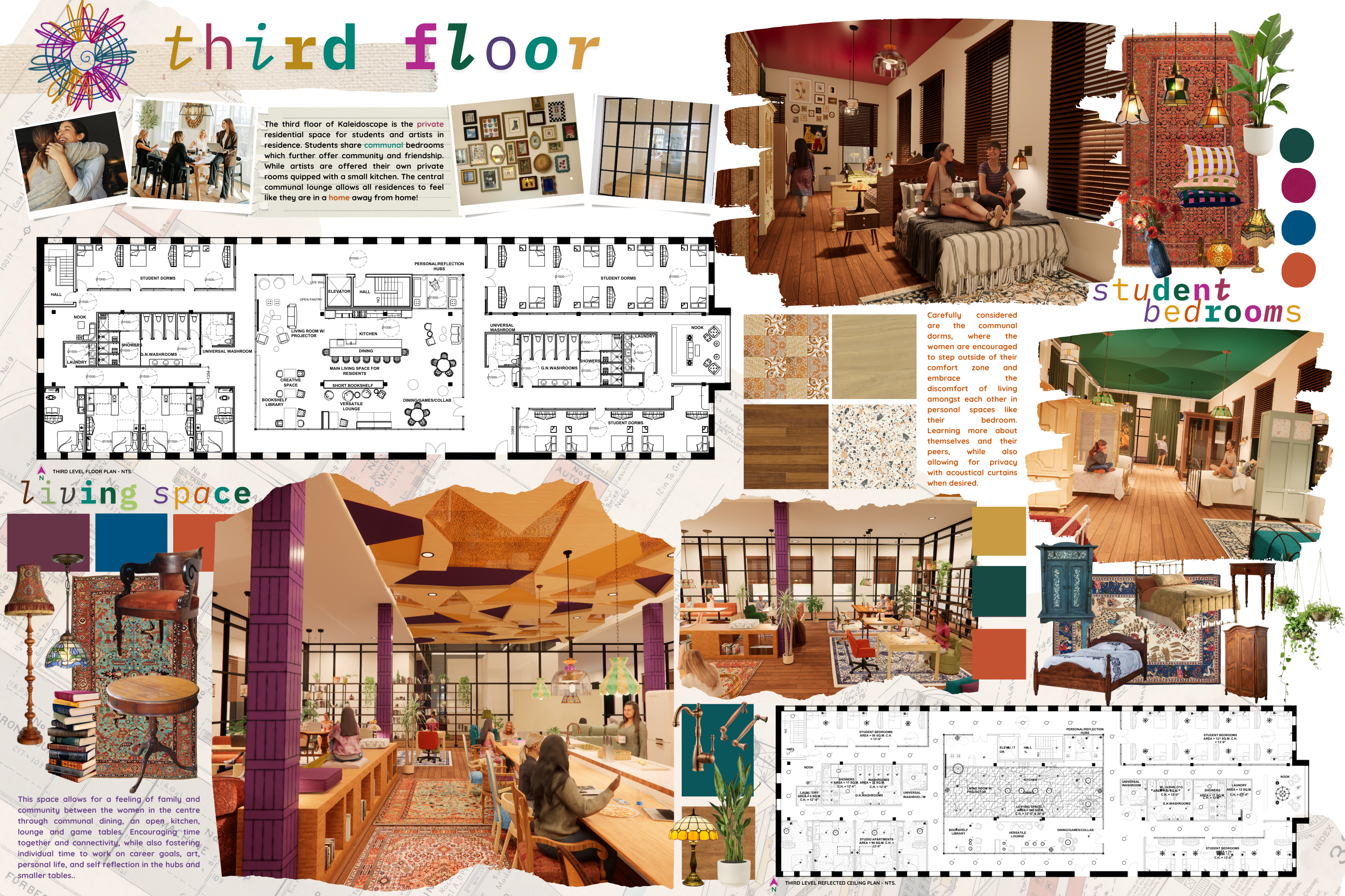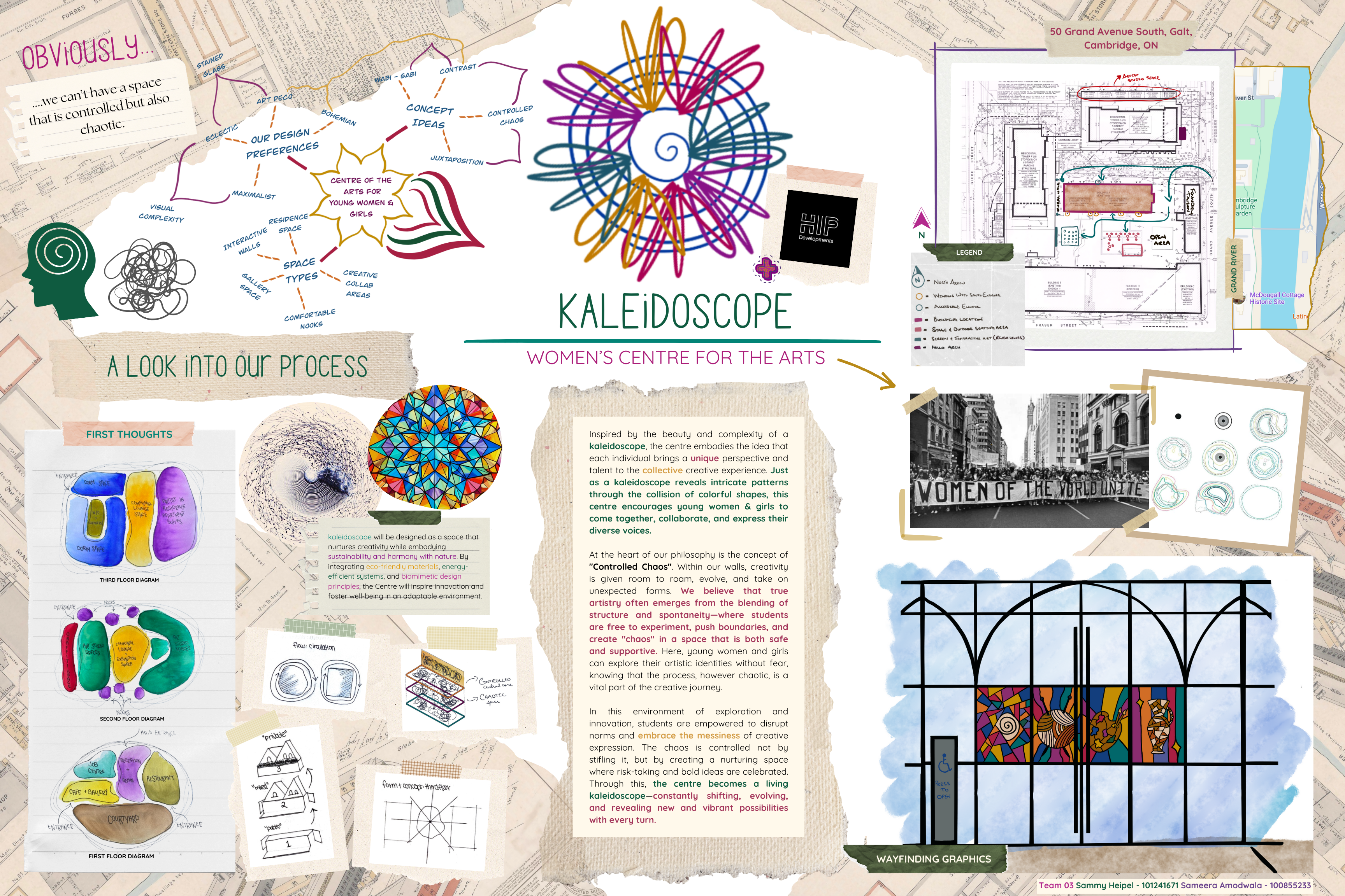 For our thesis project, my project partner and I created Kaleidoscope: The Centre of Arts for Young Women and Girls, a three-storey community space located in the revitalized Gaslight District of Cambridge, ON. Designed for HIP Developments, the centre addresses gender inequality in the arts by providing a vibrant and deeply supportive space for young women to explore artistic expression, career development, and community living.