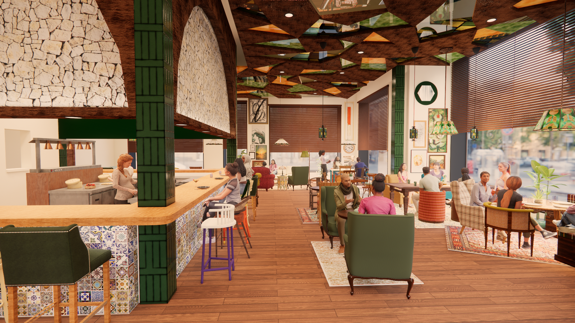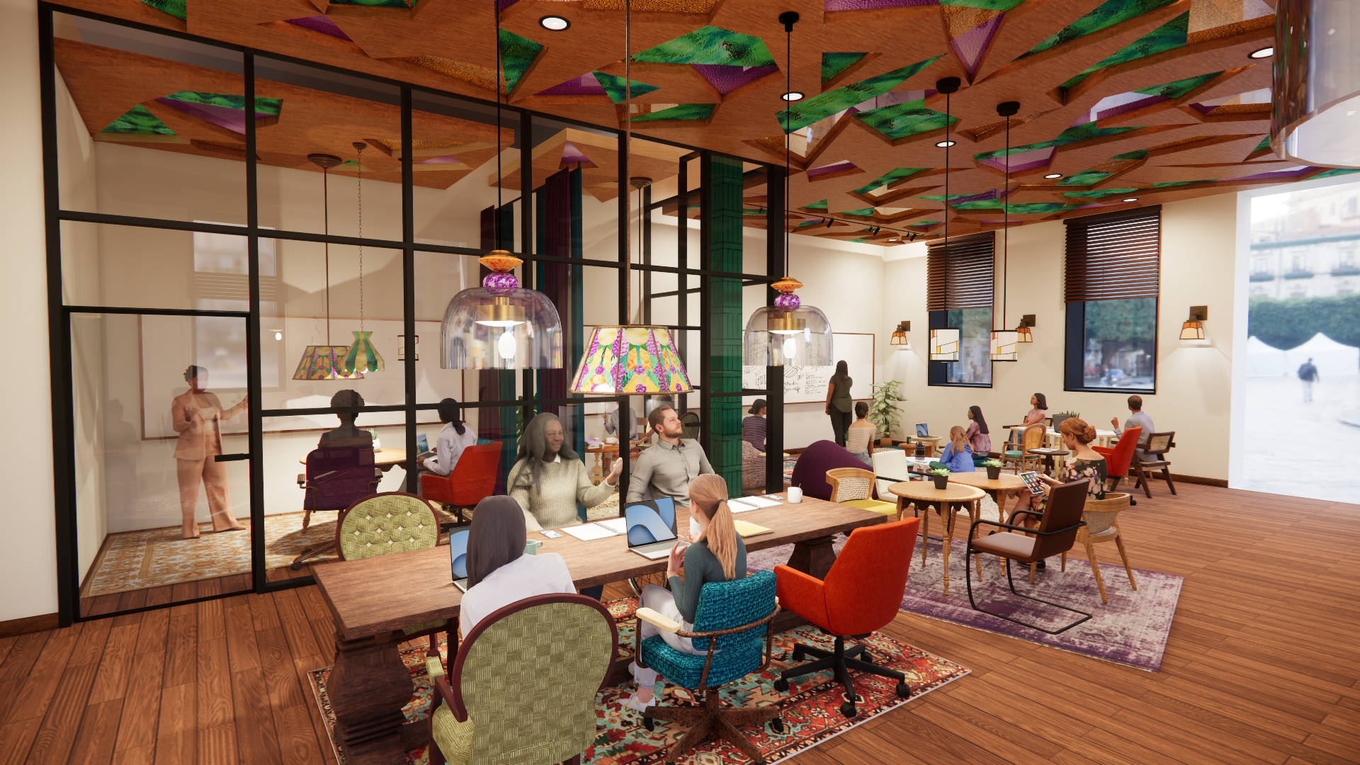 We drew on the metaphor of a kaleidoscope, ever-shifting and expressive, to guide our design decisions. From modular furniture and mural walls to artist-in-residence programs, stained glass wayfinding, and circadian lighting, every inch of the building reflects the mission to empower women creatively, emotionally, and professionally. It’s a space that embraces “controlled chaos,” where community, friendship, and artistic freedom can flourish.